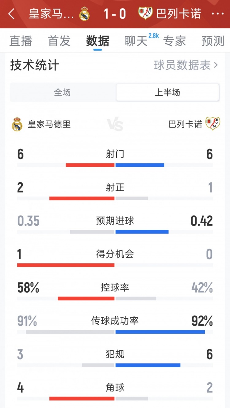 直播吧2月1日讯在本轮西甲,皇马半场战罢暂时1-0领先巴列卡诺,以下为双方半场数据对比: