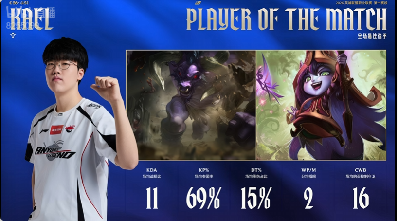 虎扑02月01日讯Kael使用牛头和璐璐拿到AL对阵TES比赛的全场MVP