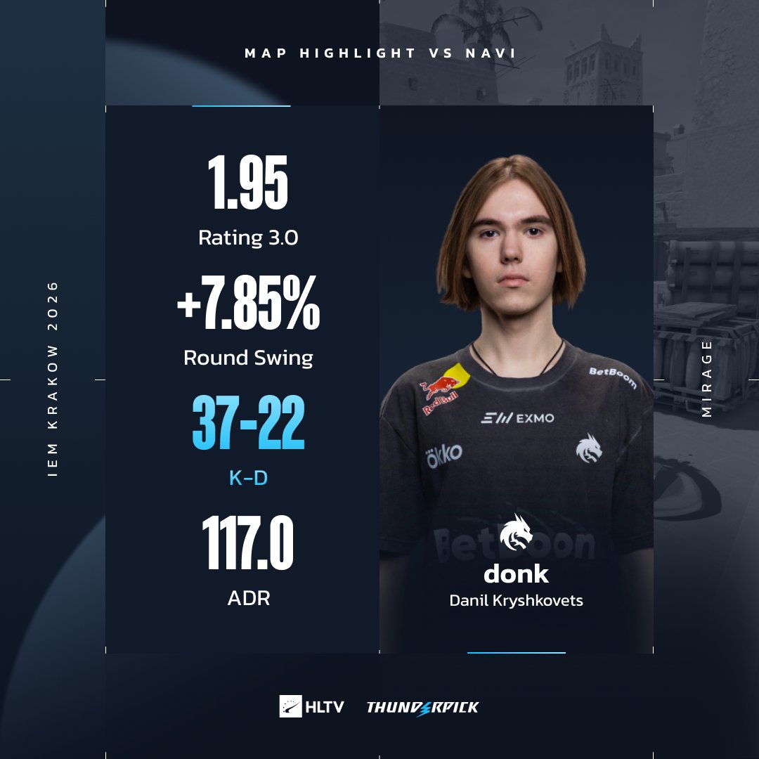 虎扑02月02日讯在刚刚结束的图一荒漠迷城中,选手donk他打出了高达1.95的Rating,交出了37-22的KD,同时场均伤害也达到117.0,全面数据领跑全场,助力队伍取得胜利。凭借此卓越表现,荣获图一MVP。