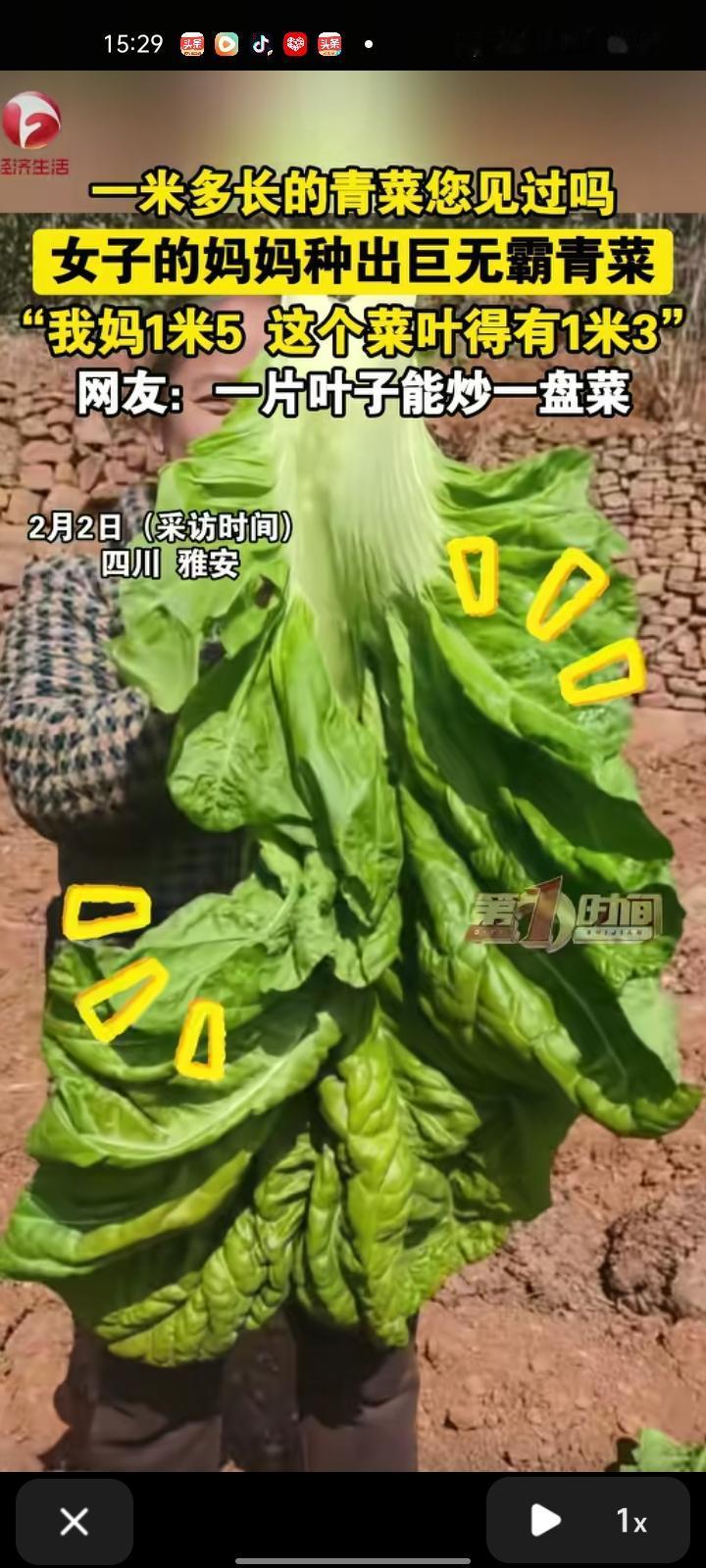 1月30日,四川雅安。常女士发视频称,妈妈种出了巨无霸青菜,菜叶有一米三,妈妈的身高一米五,菜叶快赶上妈妈的身高了。自家种的青菜是用来做酸菜的,摘的时候没发现这个菜有这么大。