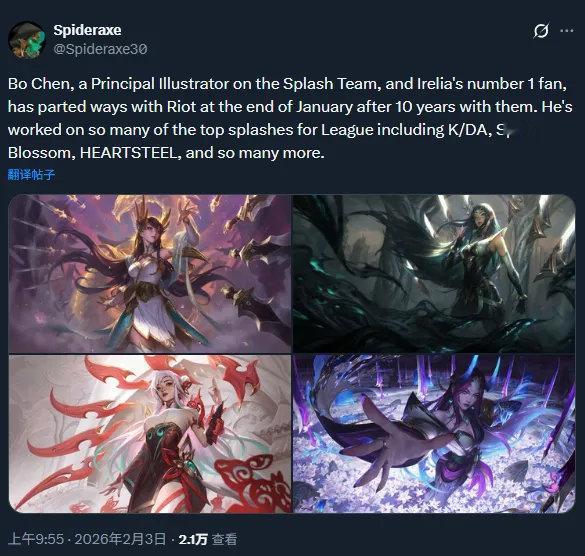 外网爆LOL原画团队首席插画师CHENBO在为拳头工作十年后于1月底离职。包括E