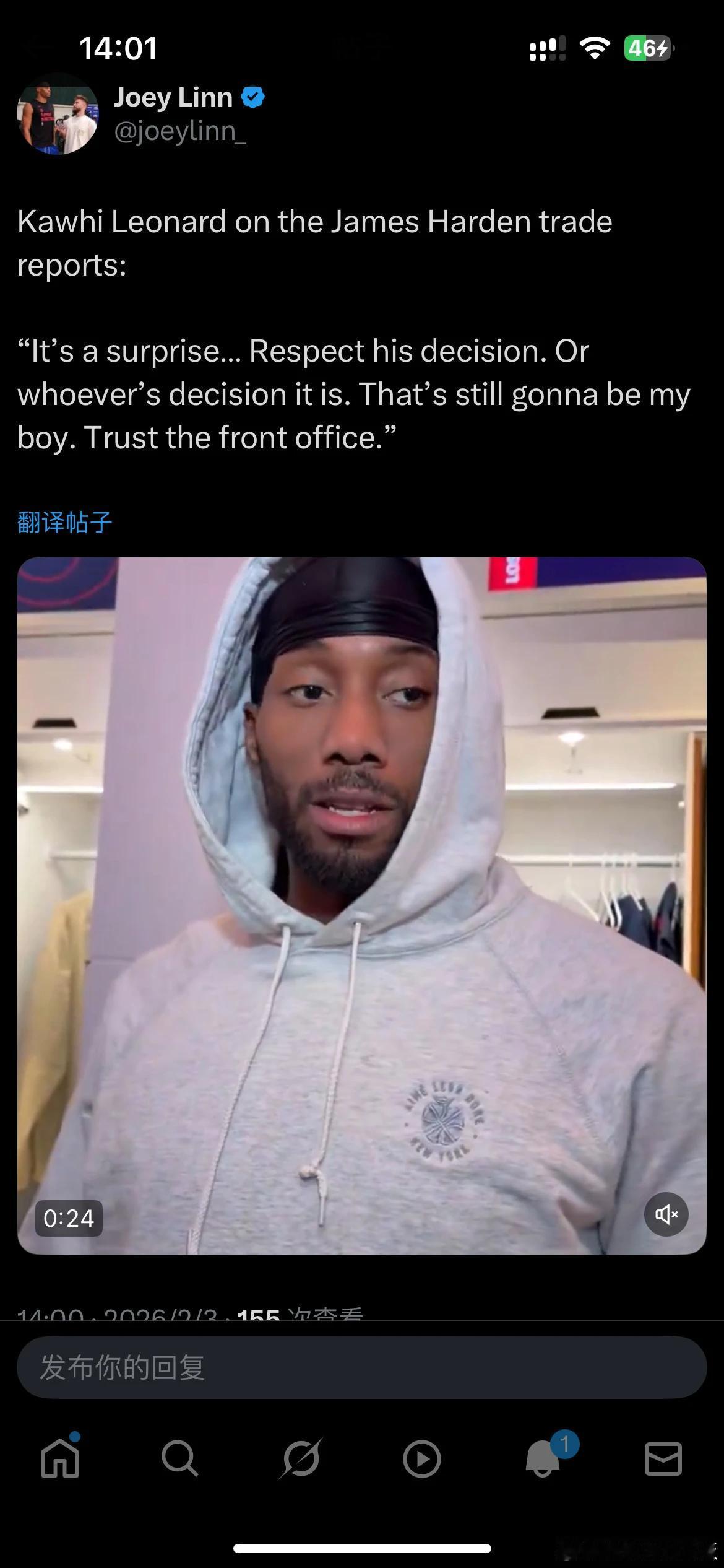 小卡赛后谈到哈登交易的报道时遗憾地说道:“这太意外了,尊重他的决定,不管说这是谁的决定。他永远都是我的兄弟。相信管理层。”让我们静待哈登的好消息,毕竟加盟骑士比待在快船有更大的夺冠机会。