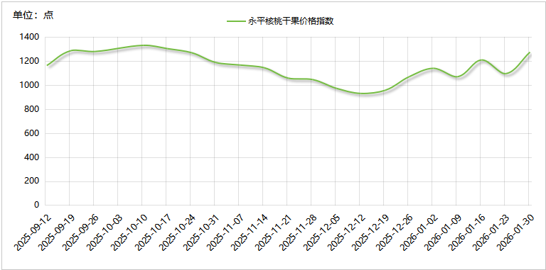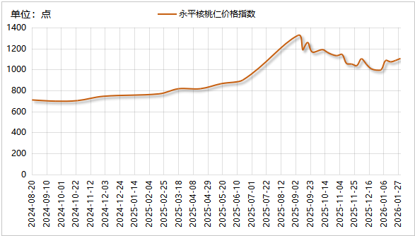 春节临近带动市场迎来节前最后一波备货高峰,礼品礼盒采购与终端零售需求双重释放,形成强劲拉动力。节前农户出货意愿有所降低,部分货源出现惜售现象,市场流通货源阶段性偏紧,进一步助推云南永平核桃仁与云南永平核桃干果价格指数联袂上行。
