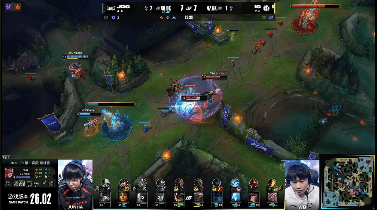 25分钟,JDG众人轮流给出机会,IG打赢劣势团战并拿下小龙