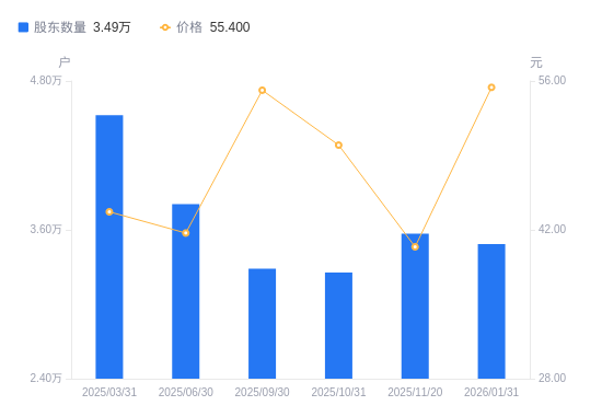 日期A股户数(户)流通A股户均持股数(股)户均持股市值(万元)2026-01-31348589708.2253.782025-11-20356829484.0238.322025-10-313255110396.2751.952025-09-303286110298.1956.772025-06-30380798887.0237.062025-03-31452467479.3132.682025-01-312750512303.5459.692024-12-313184810625.7541.442024-09-302118815971.7336.232024-06-302081416258.7229.01