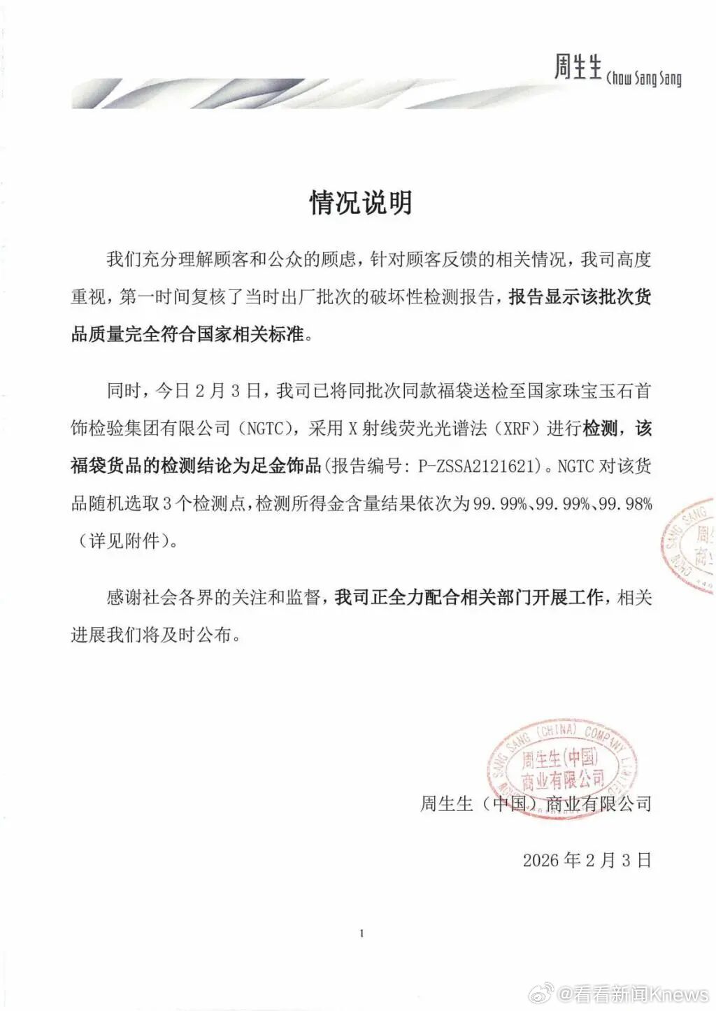 【#周生生一天2次通报#】2月3日晚,黄金珠宝品牌再次发布情况说明,针对顾客反馈的相关情况,公司高度重视,第一时间复核了当时出厂批次的破坏性检测报告,报告显示该批次货品质量完全符合国家相关标准。