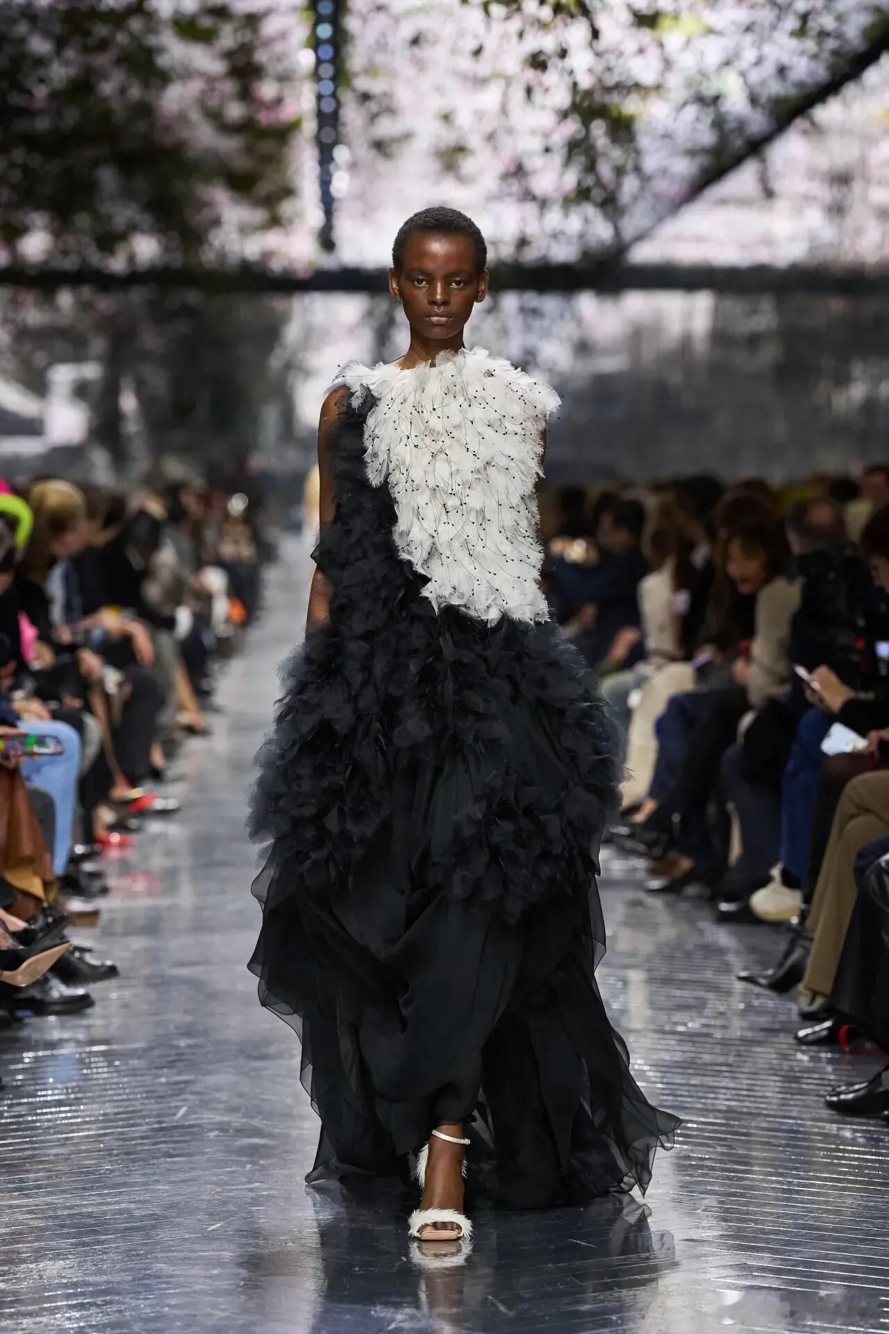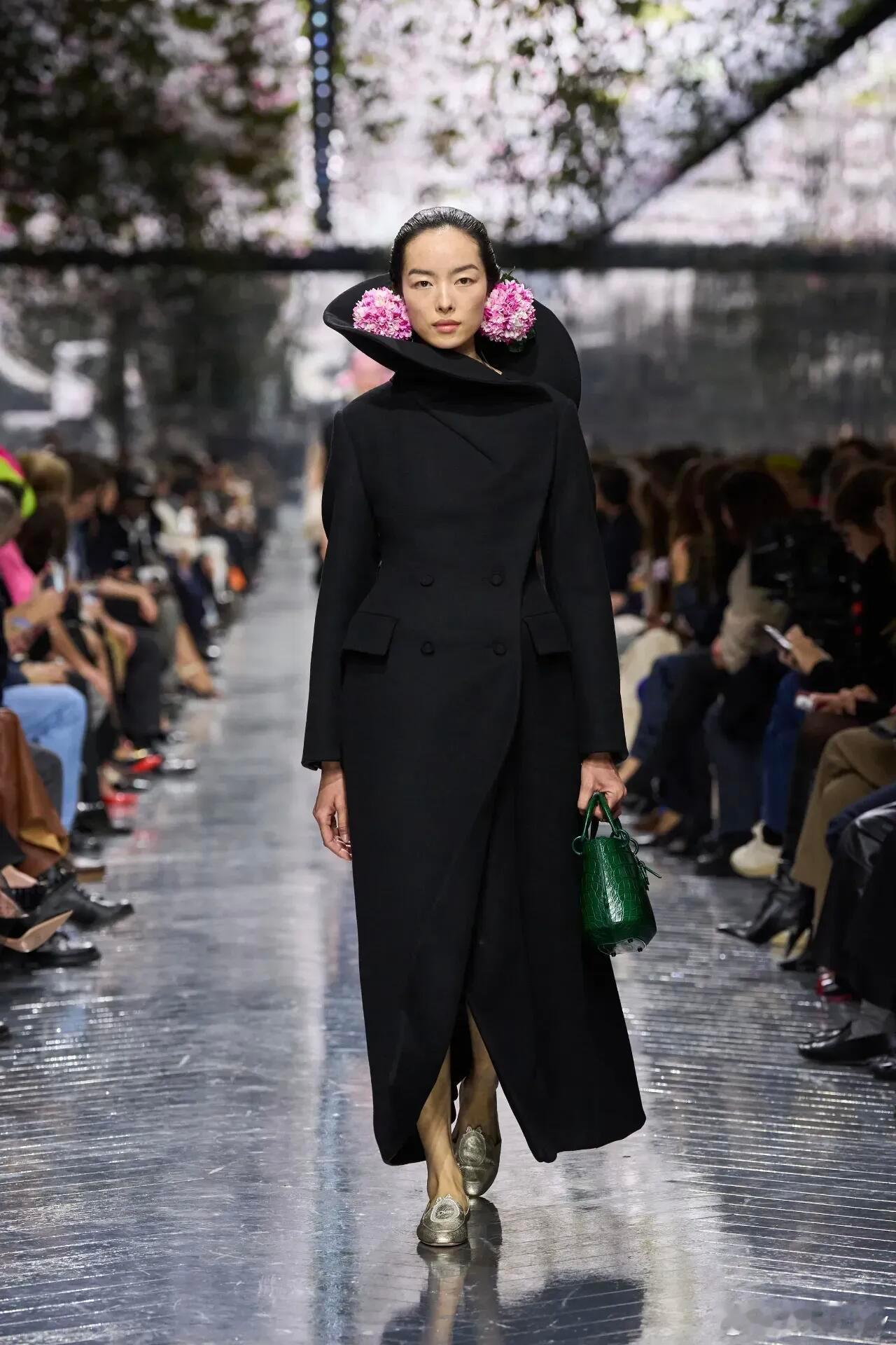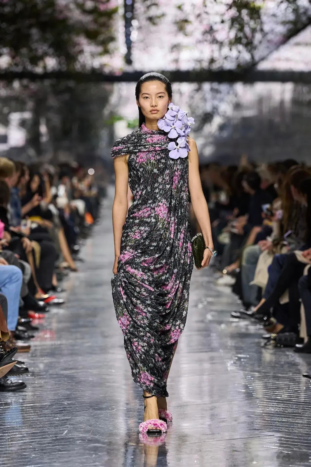 Dior 2026春夏高定:珍奇柜中,一场跨越时空的美学对话巴黎高定时装周 巴黎高定周的穹顶之下,Jonathan Anderson以Dior高级订制首秀,开启了一场关于时间、传承与创想的盛大叙事。他将整个系列构筑为一座流光溢彩的“珍奇柜”,让陨石的星际余温、化石的亿年肌理、18世纪织物的古典纹路与肖像画的细腻笔触,在当代高定语言中完成新生,为迪奥书写出“回望经典,亦赴未来”的风格新章。这场秀的灵魂,藏着一束跨越时空的诗意信物——前任创意总监John Galliano亲手采摘的仙客来,化作绣线织入薄纱、化作立体剪裁绽于肩颈、化作花瓣缀于鞋履,成为两代设计师精神共鸣的无声见证。而英国陶艺家Magdalene Odundo具拟人感的雕塑美学,则转化为裙装流畅的旋动褶皱与圆润廓形,让服装与身体达成温柔共振,每一步都似陶艺拉坯时的灵动韵律。罗丹美术馆的秀场之上,金属质感的天花板缀满盛放的仙客来,镜面光影与花卉图腾交织成梦境。模特步履轻盈,层叠的雪纺与欧根纱如羽毛般飘逸,网纱蓬蓬裙承载着洛可可式的浪漫;雕塑感十足的弧形领口与披肩,勾勒出力量与柔美的平衡;经典Bar Jacket被赋予全新生命力,从鳄鱼皮高腰款到蝴蝶结饰花型下摆设计,在解构与重塑中延续迪奥基因。配饰世界同样藏着巧思:采用18世纪古董面料的束腰手袋,经重工刺绣重焕新生;Lady Dior等经典包款以超现实廓形、宝石装饰与彩绘漆艺重构,成为可收藏的雕塑级艺术品;Roger Vivier方头鞋与饰有全新Dior标志的金色拖鞋,将复古韵味与当代态度完美融合 。更有陨石碎片打造的宽幅臂镯、微缩肖像胸针,让宇宙奇珍与古典艺术在细节处熠熠生辉。Jonathan Anderson用这场首秀证明,高级订制不是封存于时光的古董,而是孕育新观念的实验室。当古老工艺遇见先锋创想,当传承信物碰撞自然灵感,每一件作品都成为跨越时空的美学结晶,既镌刻着迪奥的历史厚度,又涌动着生生不息的当代活力——这便是高定的终极魅力,以匠心守护经典,以创意照亮未来。DIOR大秀大秀直击