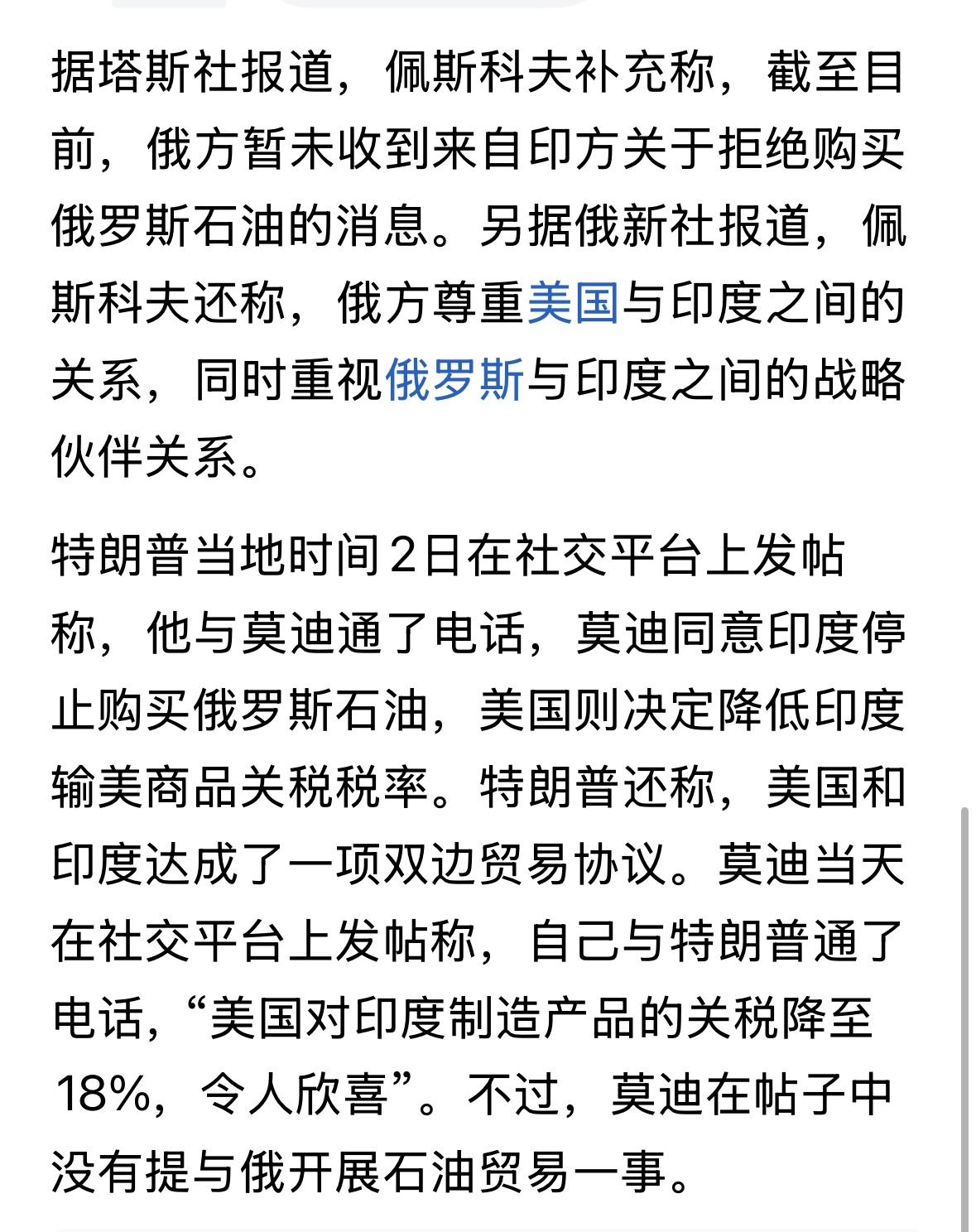 特朗普称莫迪同意停止购买俄石油,俄罗斯否认,特朗普一贯说大话,把自己的想法当成别人的行动。