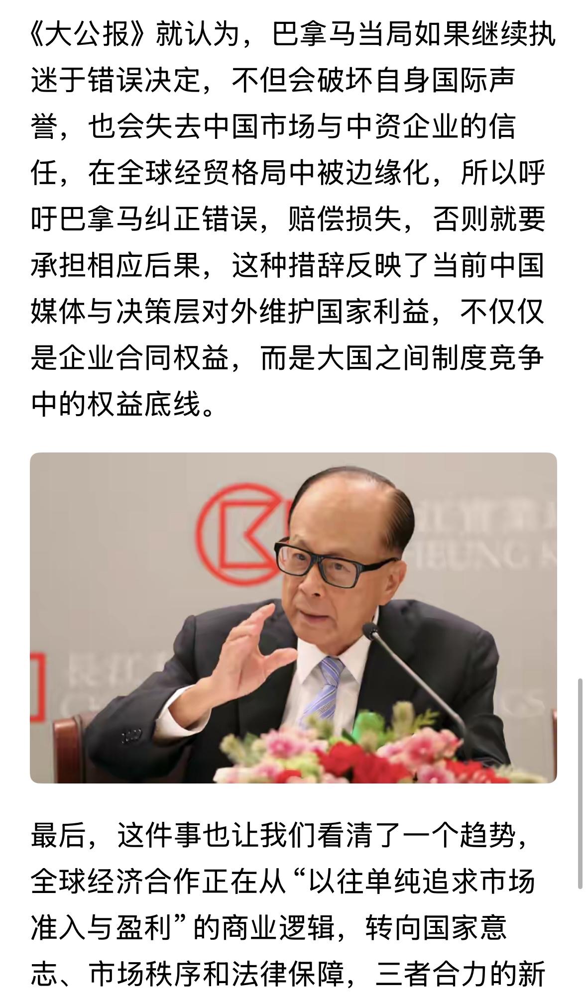 大公报这次跟李嘉诚站在一起了,他说港口交易没有成功,是因为中方要求合理控制权的原