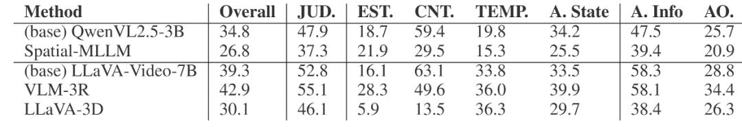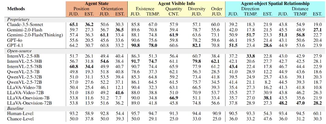传统的静态场景理解主要关注物体属性及其静态关系。而探索的智能体中不断改变自身位置和视角,带来持续更新的信息类型与更丰富的问题形态。研究团队据此将动态场景理解划分为三大信息类别:智能体空间状态、智能体可见信息、智能体 - 物体空间关系。基于这三类信息,研究团队进一步设计了 15 个子任务,覆盖判断(JUD)、估算(EST)、计数(CNT)、时间定位(TEMP) 四类题型。基于规则生成 + 人工筛选,生成了基准的 10k 条测试集数据 (1.4k 个场景) 以及用于微调的 50k 条训练集数据 (7k 个场景)。