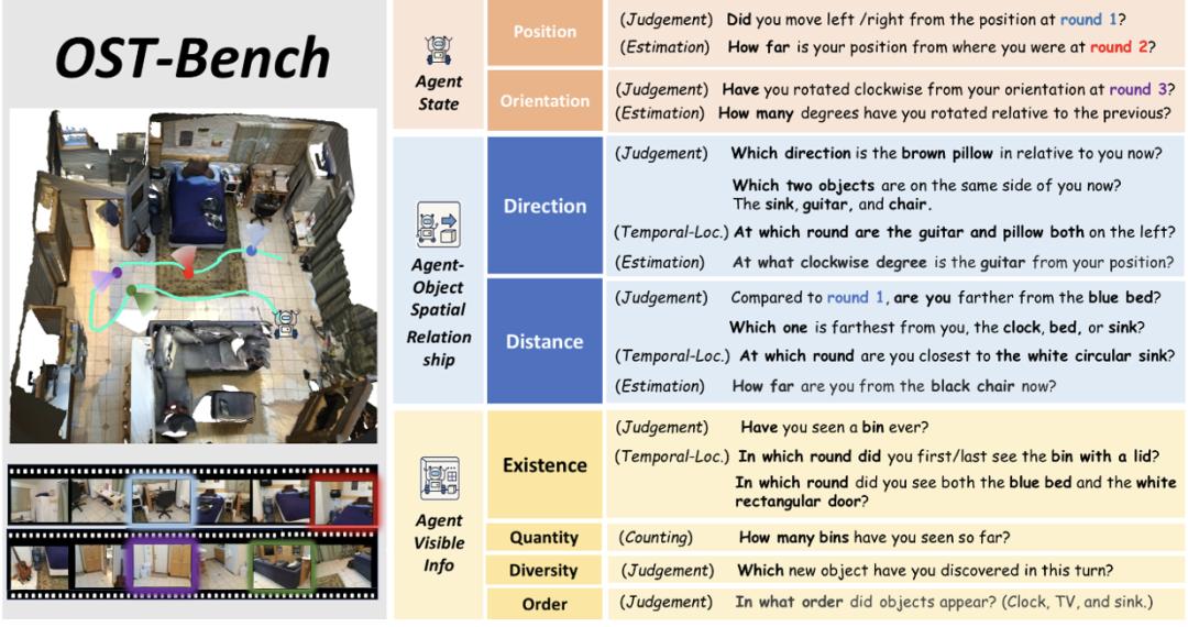 然而,以往的空间智能评测多为离线、固定输入长度,而涌现的一些在线视频评测基准往往只考察局部或语义层面的空间感知。OST-Bench 则更贴近真实世界场景,相比以往基准具有两大核心特点: