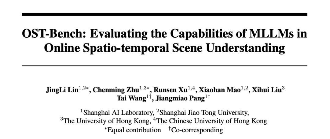 多模态大语言模型(MLLMs)已在视觉与语言模态融合的感知与推理任务中展现出强大能力。而上海人工智能实验室、上海交通大学、香港大学、香港中文大学的研究者们提出的的 OST-Bench, 则是从智能体探索场景的动态在线视角出发,为大模型的能力提出了新的挑战。
