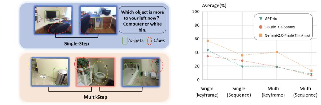 为了更精确地定位模型的能力边界,研究团队设计了一个针对性子集。和之前的测评不同,这次 (1) 按难度分级:研究团队按是否需要多步的复杂推理 (如下图) 以及是否提前提出关键帧,将问题划分为四个难度等级。对比单步关联,多步空间关联任务要求更强的推理能力;对比只有关键帧输入,全视频输入则需在冗长观察中识别用于解答的关键帧。