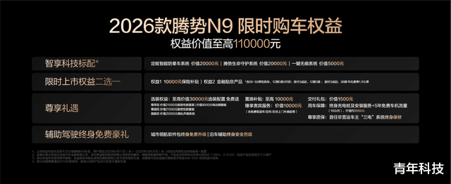 为回馈广大用户的支持与信赖,2026款腾势N9特别推出限时购车权益:10月31日(含)前提车的用户,全系可享10000元保险补贴或金融贴息(二选一),置换补贴至高10000元。此外,还有价值45000元的智享科技,以及辅助驾驶终身免费豪礼。根据不同款型,限时赠送极致性能套装、电动侧踏板、隐私声盾等科技豪华配置。智能电动门、吸顶屏套装、流媒体外后视镜以及双色车身均享限时选装价格,让豪华触手可及。详情敬请咨询腾势直营店及当地经销商。