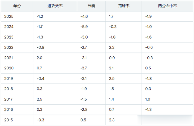 从表中可见,过去四年季后赛进攻效率下降,这是个新现象。2015至2022年间,季后赛罚球率上升,两分命中率稳定,但近三年篮下得分变得更难。本季两分命中率差值最大,绝对值52.5%是疫情前最低。