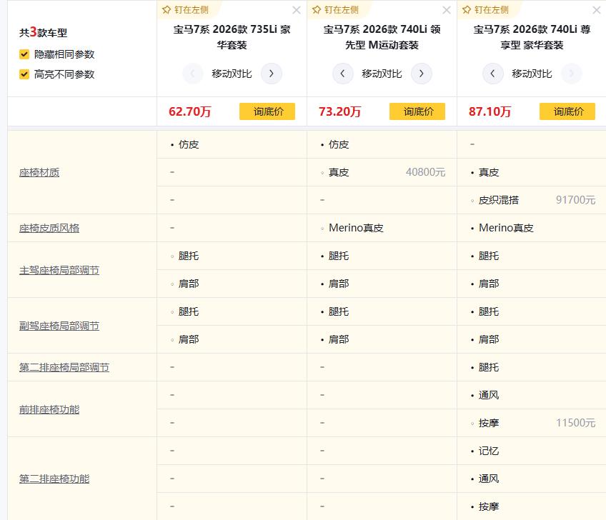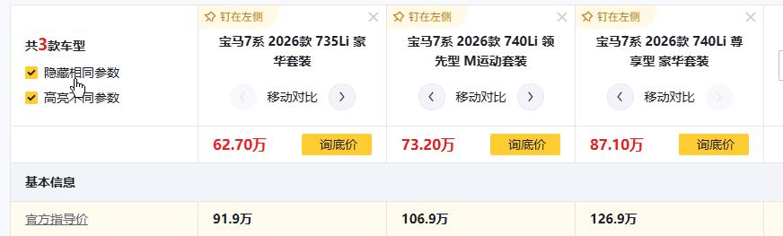 三款车的官方指导价如下所示:735Li版91.9万,740Li领先型106.9万(差15万),740Li尊享型126.9万(比领先型再差20万),钱花在哪、值不值?继续往下看。