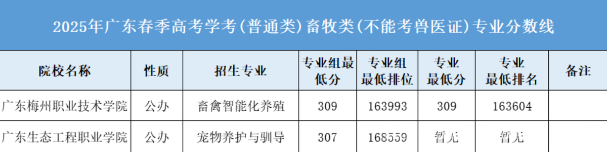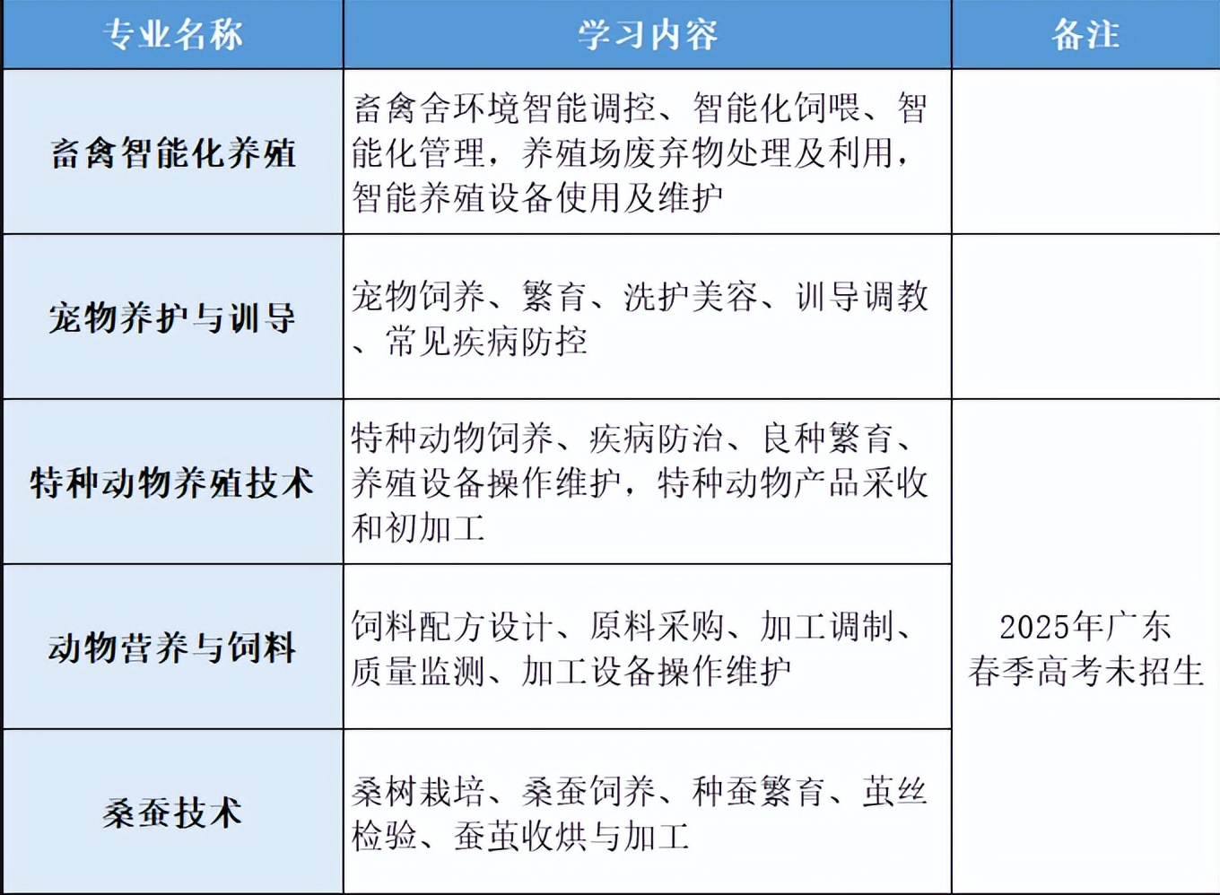 在广东春季高考中,开设畜牧类专业的院校并不多,主要集中在涉农类、工程类高职院校。主要招生院校包括: