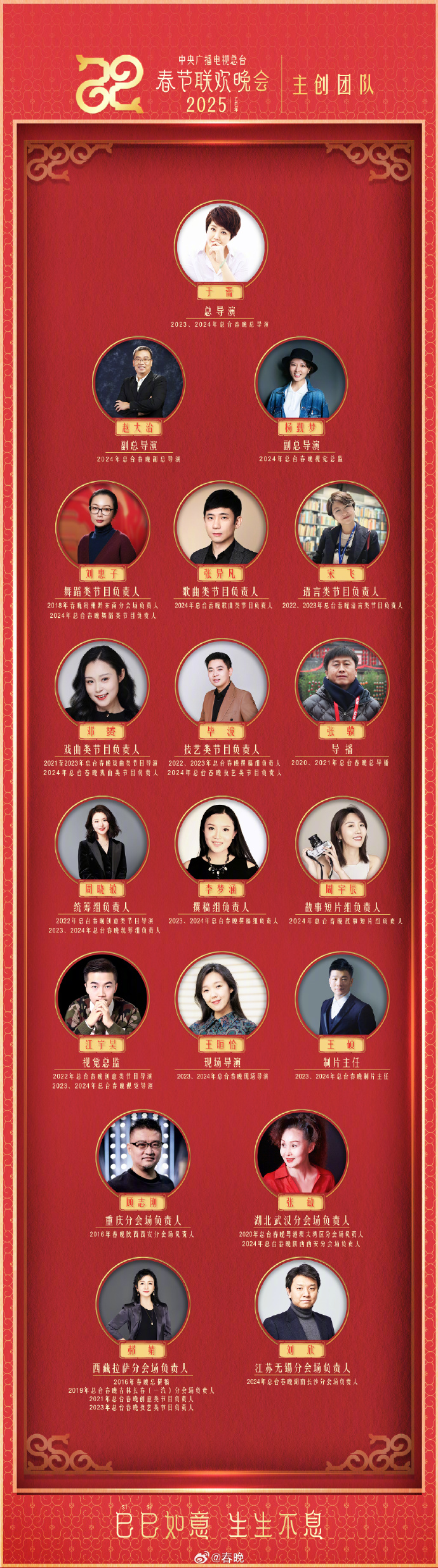 2025年中央广播电视总台春节联欢晚会(春晚)的主创团队已于12月29日正式官宣。据悉,本届春晚的总导演为于蕾,副总导演包括赵大治和杨觐梦。此外,刘惠子、张异凡、宋飞、邓赟、毕波、张骥、顾志刚、张敏、郝婧、刘欣等也加入了主创团队,共同推进春晚的创作工作。