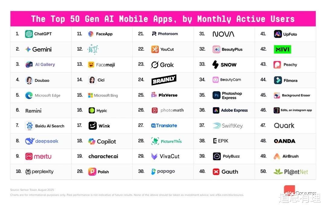 与之对比,全球AI应用市场上,众多细分赛道则相对活跃。从A16Z最新发布的一份《全球百强AI消费者应用榜单》第五版可见,除了几个“老面孔”覆盖了几乎所有高频场景—学习、陪伴、设计、生产力、社区,作为“黑马”的几款产品来自不同的领域。比如主打氛围编程的Lovable直接冲到第22位,Suno首次把音乐生成带入主榜。