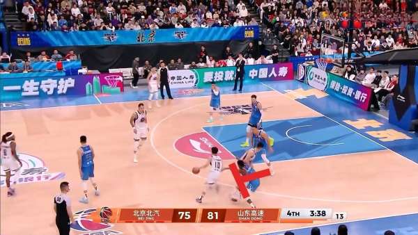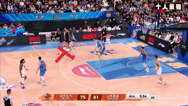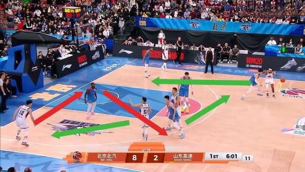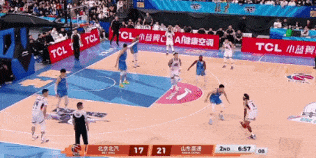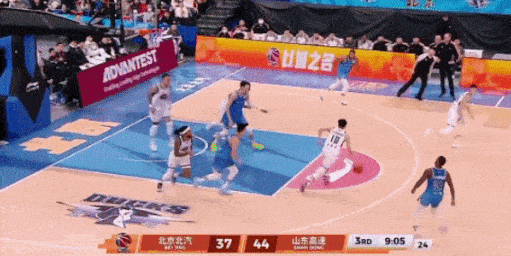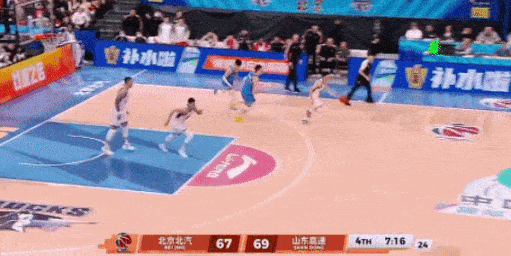 于是又借助陶汉林掩护突破,迫使北京换防,由周琦防守他,于是从罚球线再跑出来,准备军训周琦