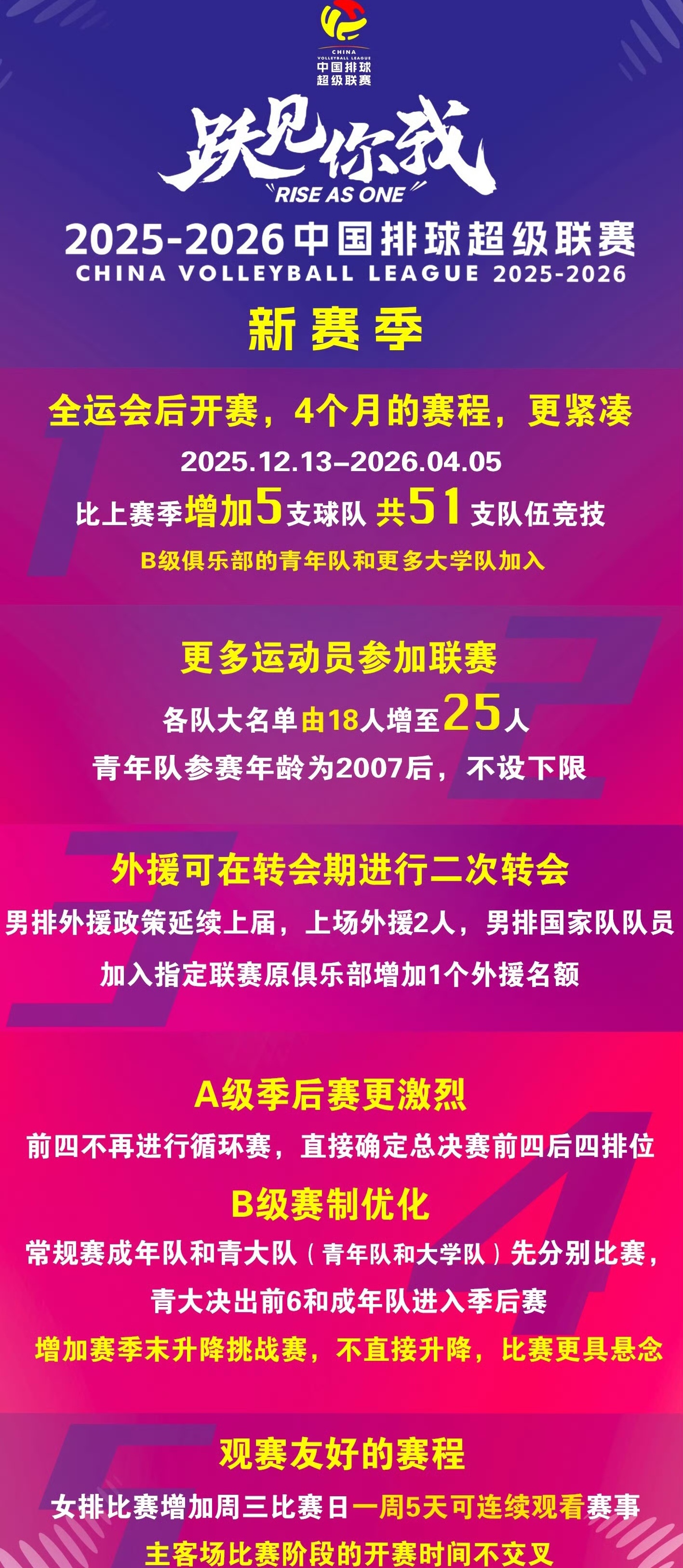 上个赛季是排超联赛的一次改革,我们引入了升降级制度,而深圳女排成为了被降级的球队,这样的比赛才会竞争更加激烈,不然像河北女排那样,真的是不愠不火的每年都当送分童子,相反的河北男排却在引进外援以后发生了巨变。10月1日的晚上,排超联赛官方媒体发布了新赛季排超联赛相对于去年的一些变化,我们一共能够看到六点主要变化,首先就是参赛的球队从46支增加到了51支,这包括A级球队和B级球队,还有大学球队,组成还是比较丰富。