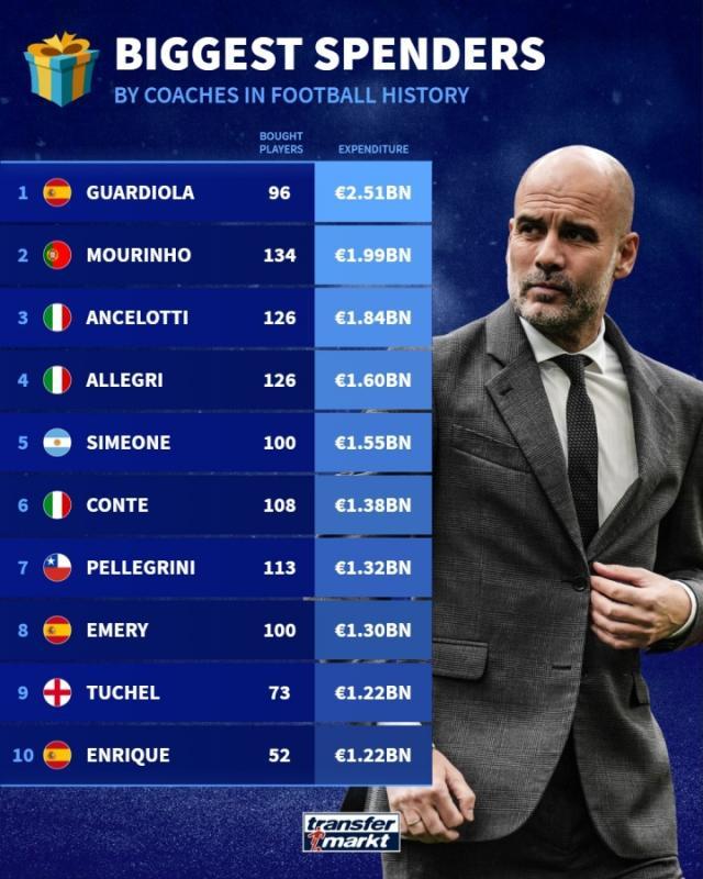 1.瓜迪奥拉:25.1亿欧,引进96人