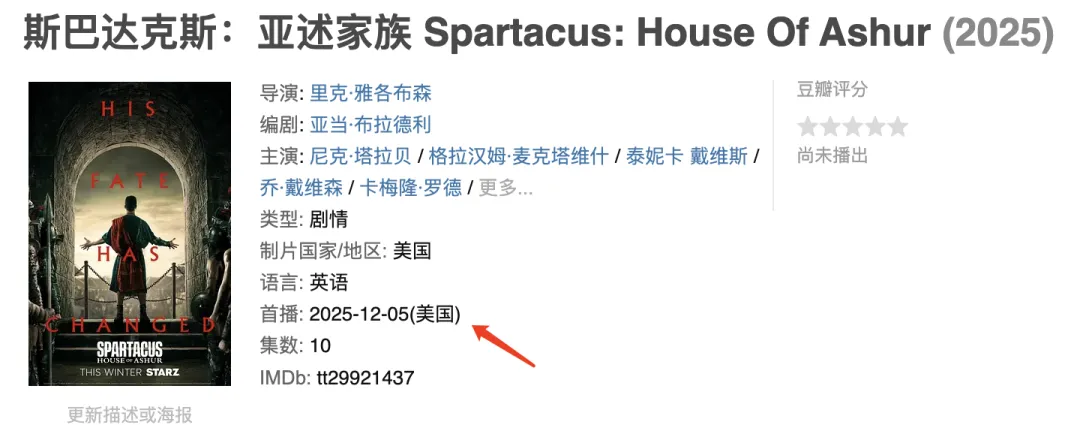 Starz官方亲自宣布《斯巴达克斯:亚述家族》, 定档12月5日回归。