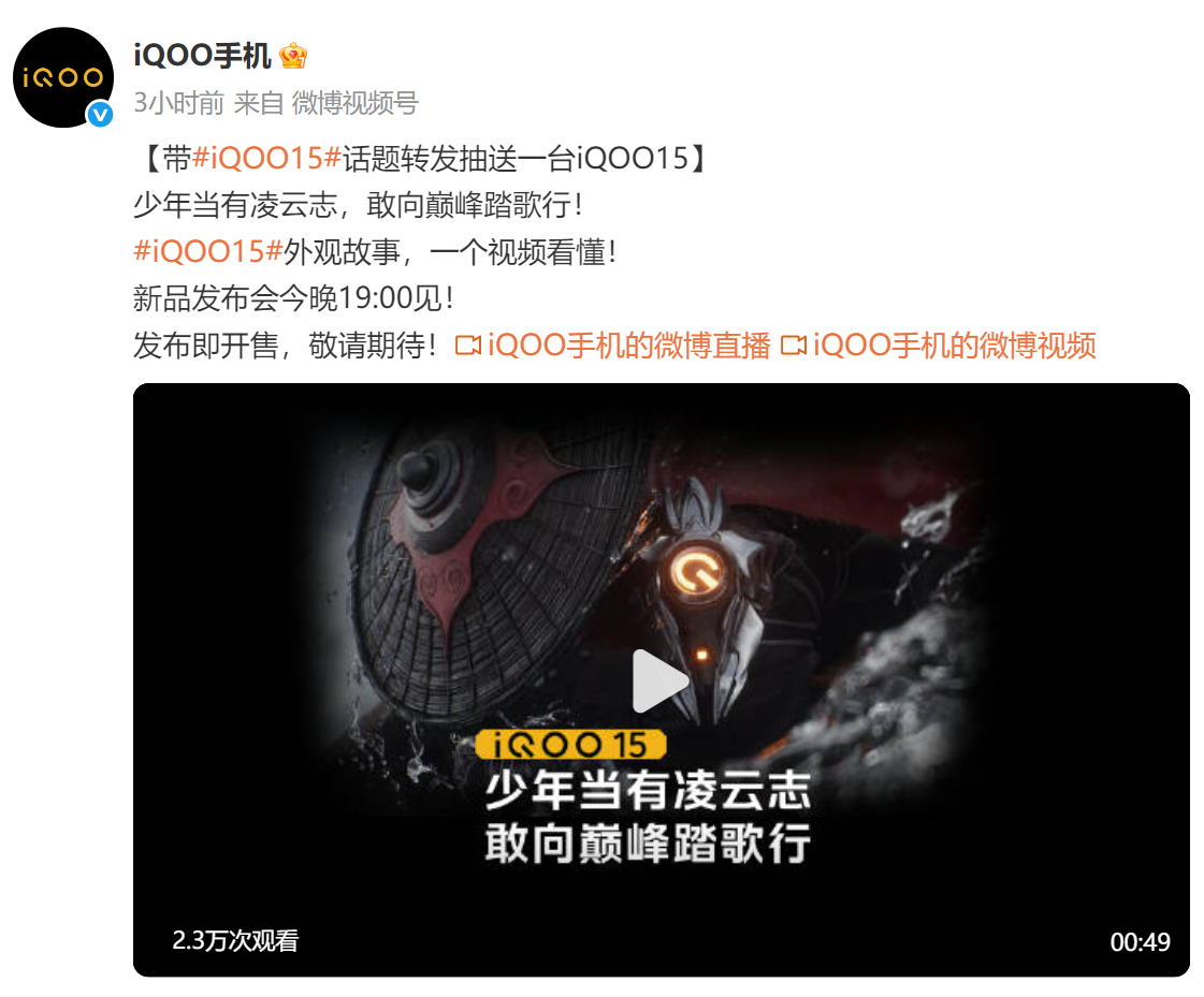 拥有着潮酷电竞外观的全新iQOO 15,终于要在今晚正式发布啦!相信很多人对此期待已久,目前新机搭载的各项配置官方已经公布得差不多了,至于价格大家可以猜一下,今晚19:00正式揭晓谜底!下面,赶紧来抢先一步看看它都有哪些亮点吧。