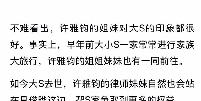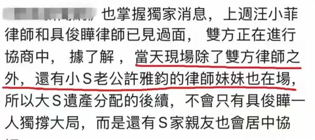 这次会面,小S的老公许雅均和其律师妹妹也在场,这说明小S老公许雅均家出手了。