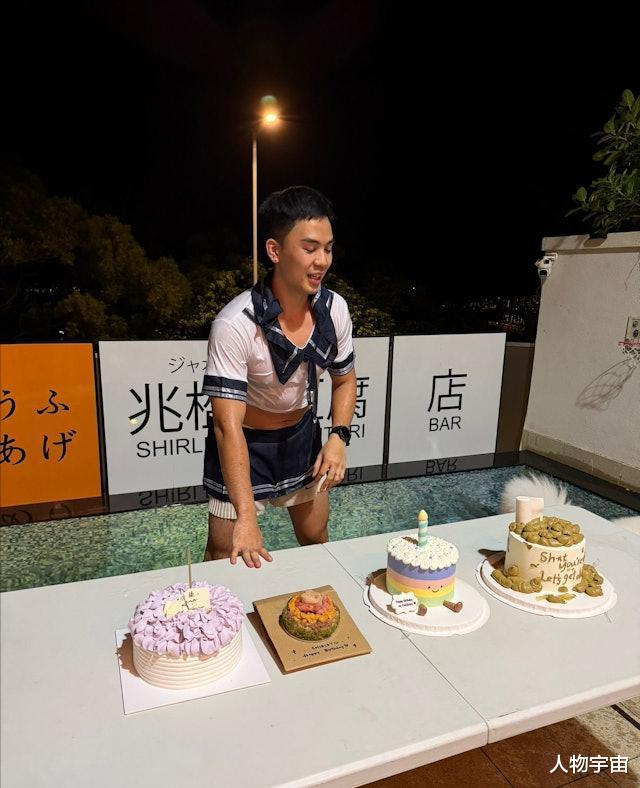 这场庆生派对以电影《头文字D》作为主题。为了博太太一笑,伍富桥也是拼了,反串电影中女主角“茂木夏树”,穿上了经典蓝白色水手服校服裙,一出场就掀起派对高潮。