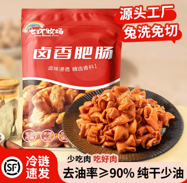 1. 七环牧场卤香肥肠——懒人党“零失败”选择核心亮点:85%去油率+低温慢卤,干净到敢直接空口吃!作为常年霸占火锅食材榜单的“网红选手”,七环牧场的卤肥肠简直是懒人福音。实测拆开包装时完全没有传统肥肠的腥臭味,人工反复搓洗,内壁油脂刮得干干净净!