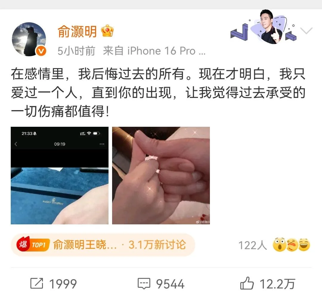 5月17日凌晨,俞灏明在微博晒出钻戒和拉钩照片,并配文:“直到你的出现,让我觉得过去承受的一切伤痛都值得!”这番深情告白迅速引发全网关于他与王晓晨结婚的猜测,#俞灏明王晓晨结婚#话题火速登顶热搜。