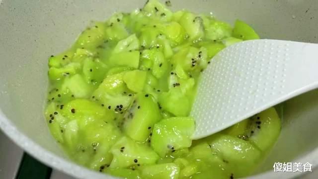 4、当果汁减少,猕猴桃变得软烂,酱汁能挂在勺子上时,挤入半个柠檬的汁液,柠檬的酸性能让猕猴桃的甜味更有层次感,而且还能防止果酱过快变质,继续煮2-3分钟,就可以关火啦。