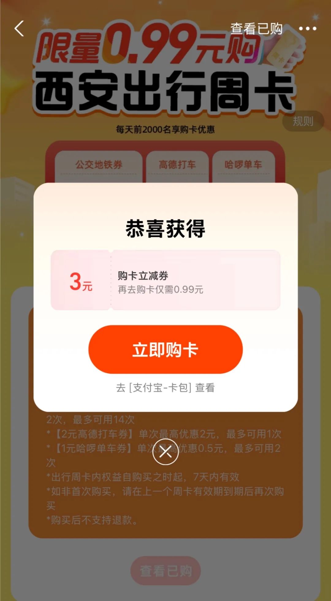 点击“0.99元购西安出行周卡”