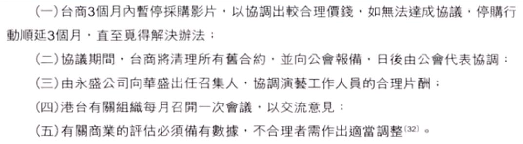 当年六月份,“香港电影从业员协会”便与台湾方面进行了会谈,参与会议的台商有杨登魁,王应祥,蔡松林,邱復生等人,而香港方面的代表则是新宝院线的陈荣美,东方院线的黄百鸣,永高院线的罗杰承,以及永盛老板向华胜,在经过一番讨价还价之后,双方最终达成了这样五条协议:比如达成协议后再采购港片,向华胜负责协调明星片酬,以及成立相关部,评估数据等。