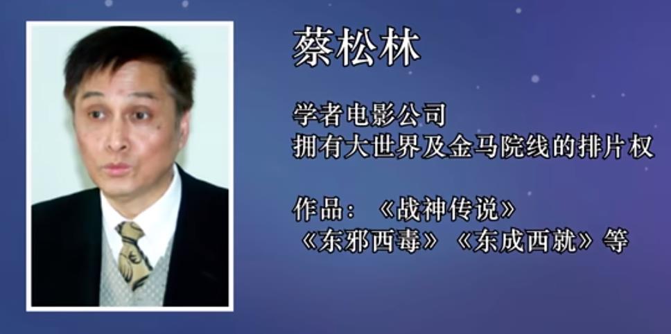 八大片商的第三位是“学者公司”董事长蔡松林,拥有大世界及金马院线的拍片权,曾投资过刘德华的《战神传说》结局大家也知道的,让他血赔,还有刘镇伟,王家卫的泽东电影,他也是是幕后的金主,《东邪西毒》《东成西就》便是他投资的,另外他还是永盛公司的股东,实力堪称雄厚。