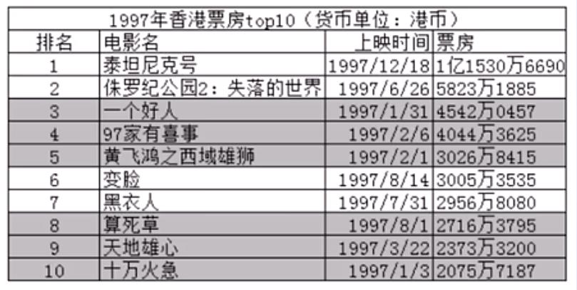 之后的几年里,虽然港片又夺回了几次年冠,但整体上却远不如以前那样有压倒性的优势,好莱坞大片开始频繁的出现在年度十大卖座佳片之,97年的大船更是又一次刷新了香港影史的最高票房纪录,港片自此再无还手之力,香港电影的黄金年代也就此一去不复返。