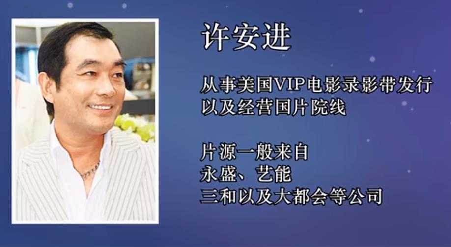 这八大片上的最后一位是从事美国vIP电影录像带发行,以及经营国片院线的许安进,他的片源一般来自香港的永盛、艺能,以及大都会等公司。