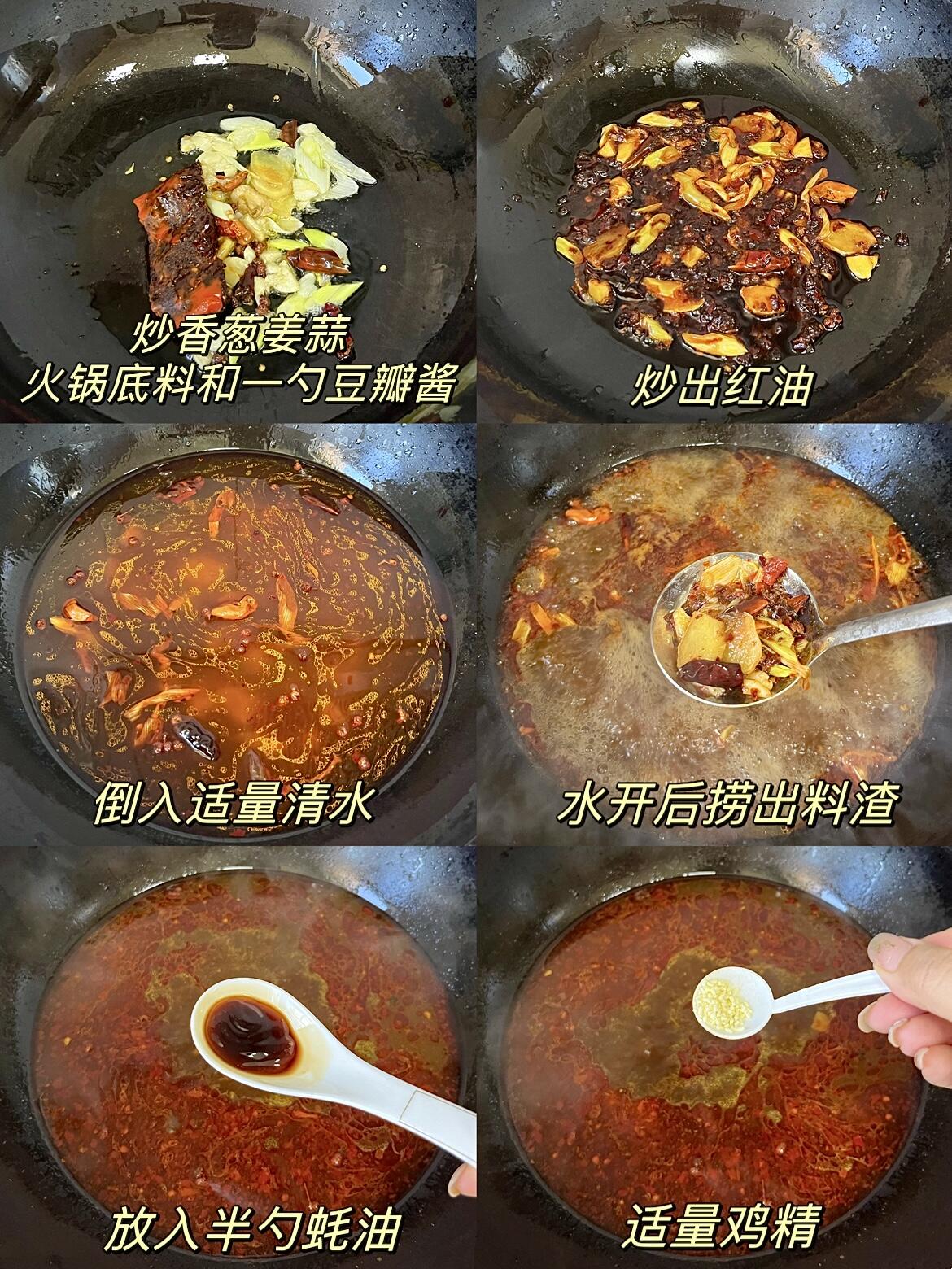第二步,炒制底料。锅中倒入适量油,油热后放入葱姜蒜爆香,接着加入火锅底料和一勺豆瓣酱,小火翻炒,炒出红油。这一步是关键,红油炒得好,整道菜的味道就成功了一半。炒的时候要注意火候,避免底料炒焦。