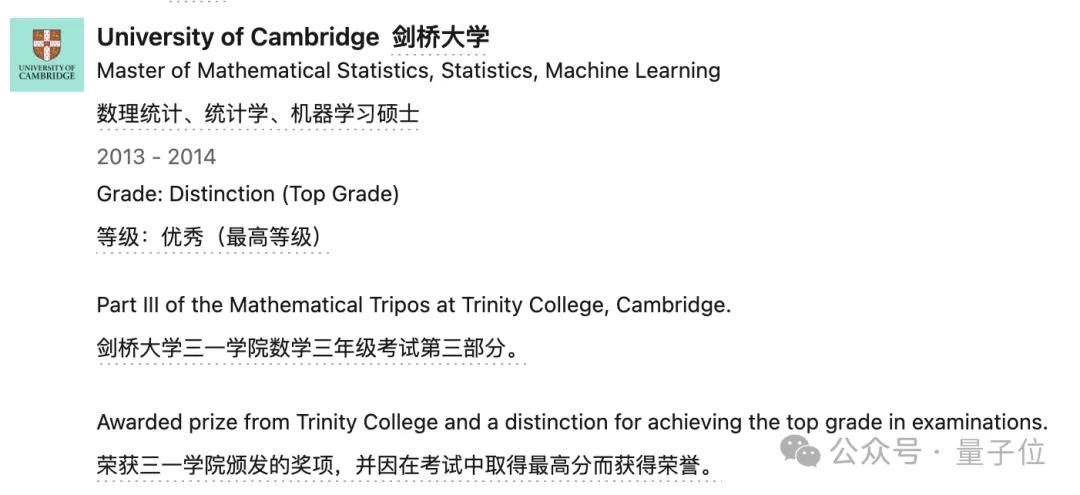 再然后又于2013-2014年攻读了剑桥大学的数理统计、统计学与机器学习硕士,表现优异,荣获三一学院颁发的奖项,并因在考试中取得最高分而获得荣誉。