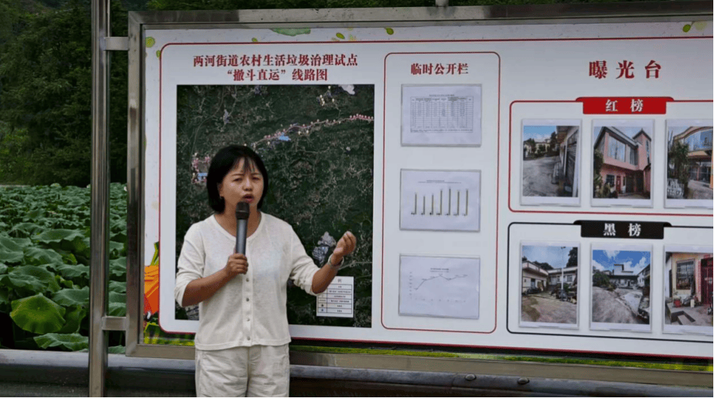在鄢官居委会,两河街道党工委现场委员王莲同志向代表们介绍“撤斗直运”、“红黑榜”、“四员”(分拣员、指导员、监管员、监督员)等相关垃圾治理工作开展情况。
