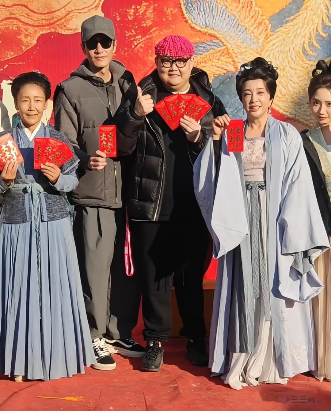 刘晓庆梳着古装发型,穿着薄衫看起来非常单薄,但她心态非常好,脸上看不出一点不适的感觉。面对镜头时她直接把剧组发的红包放在胸前,然后积极配合比姿势。