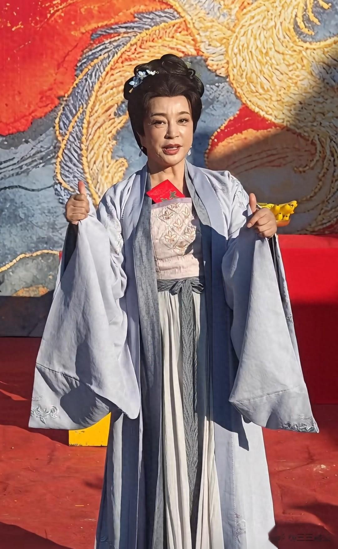 同剧组的年轻工作人员都穿着厚重的羽绒服,而人到晚年的刘晓庆穿着薄薄的古装戏服现身,75岁高龄的她依旧笑容满面,即使在寒冬中也表现得积极乐观。