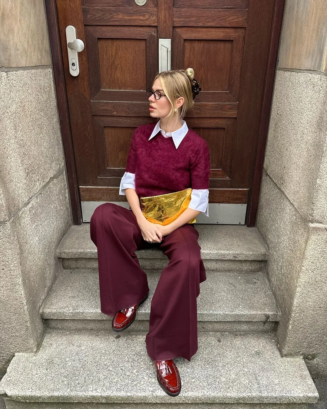 酒红色毛衣自带浓郁的复古氛围,