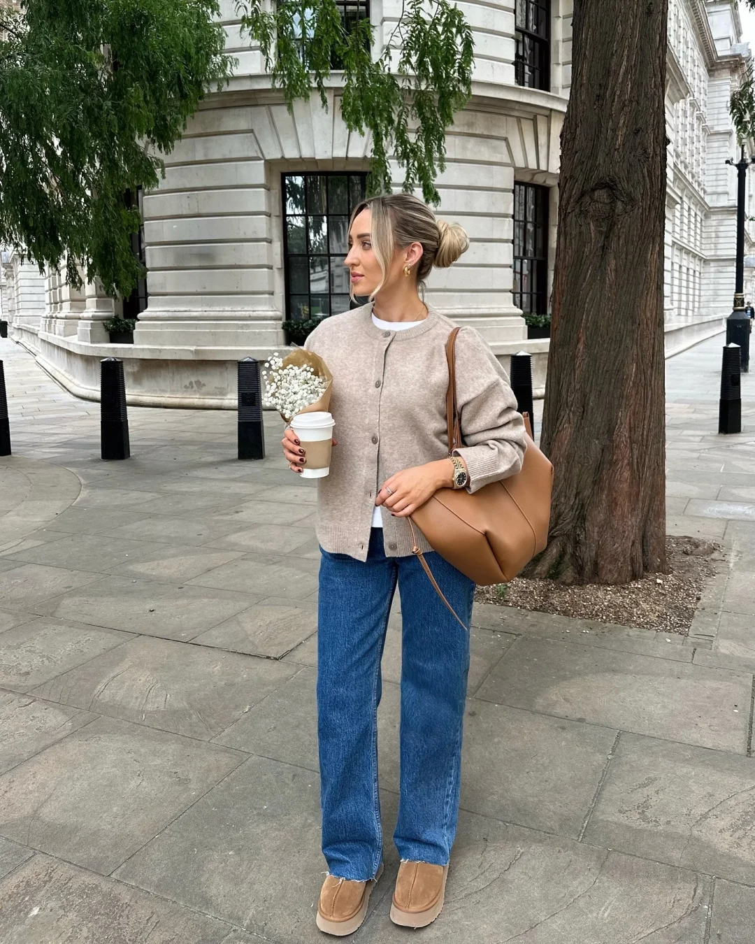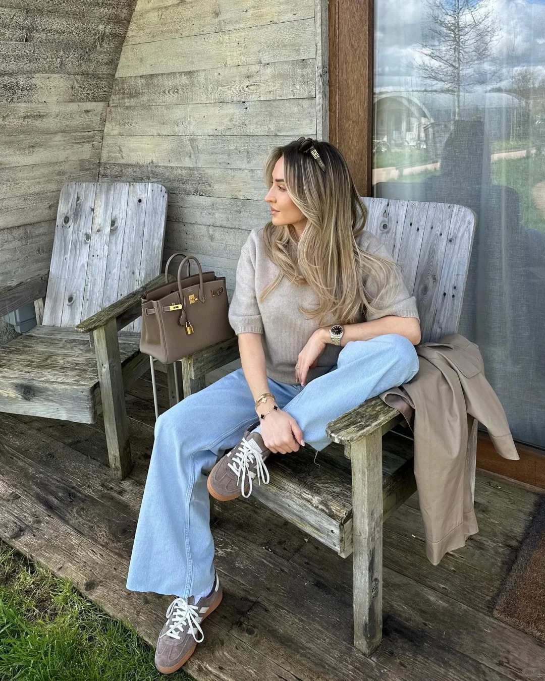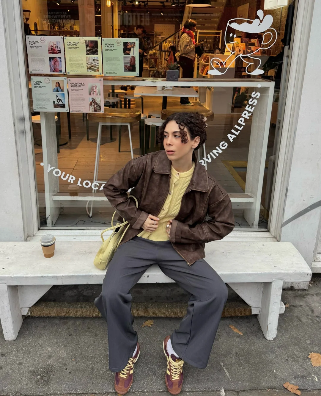 用棕色运动鞋与棕色包包形成暖调呼应,
