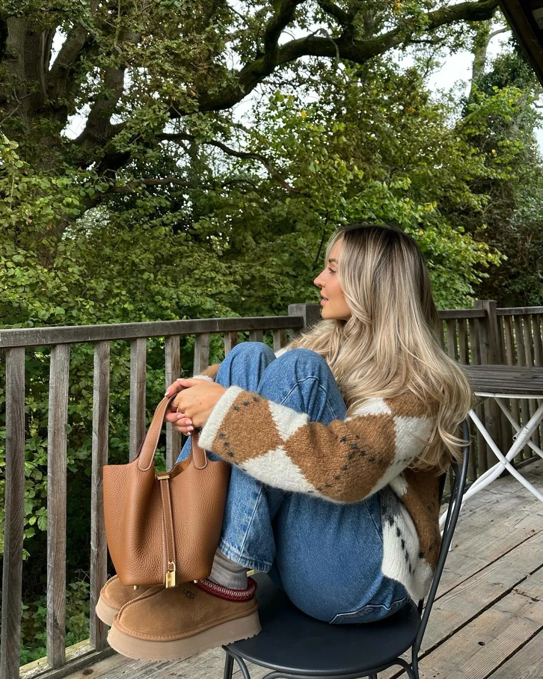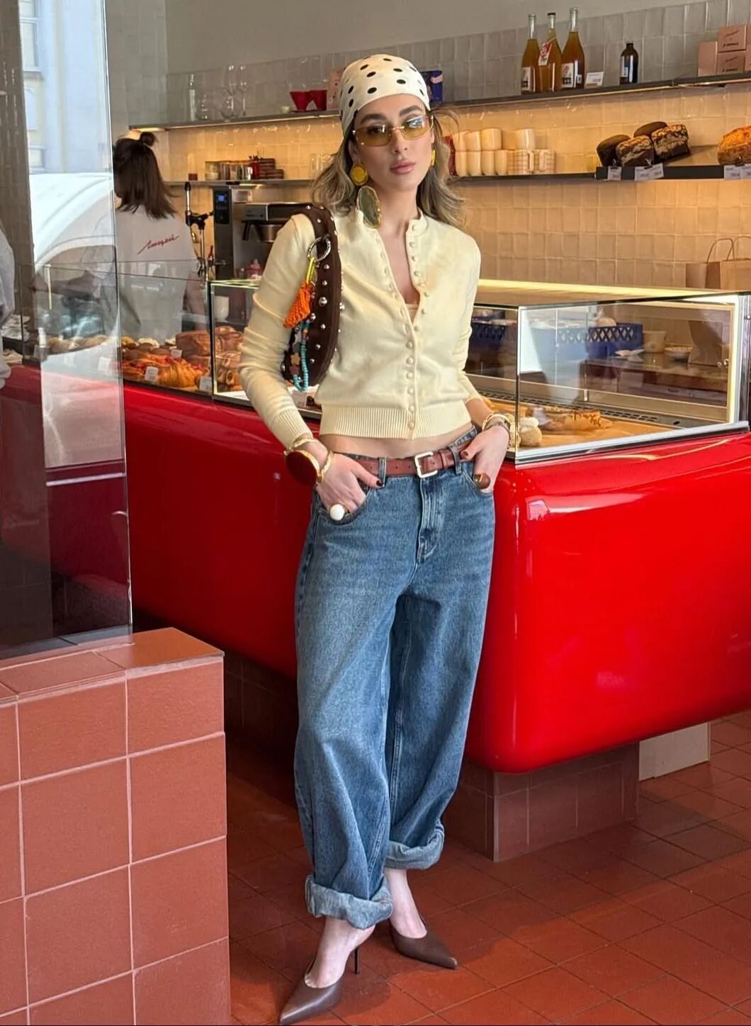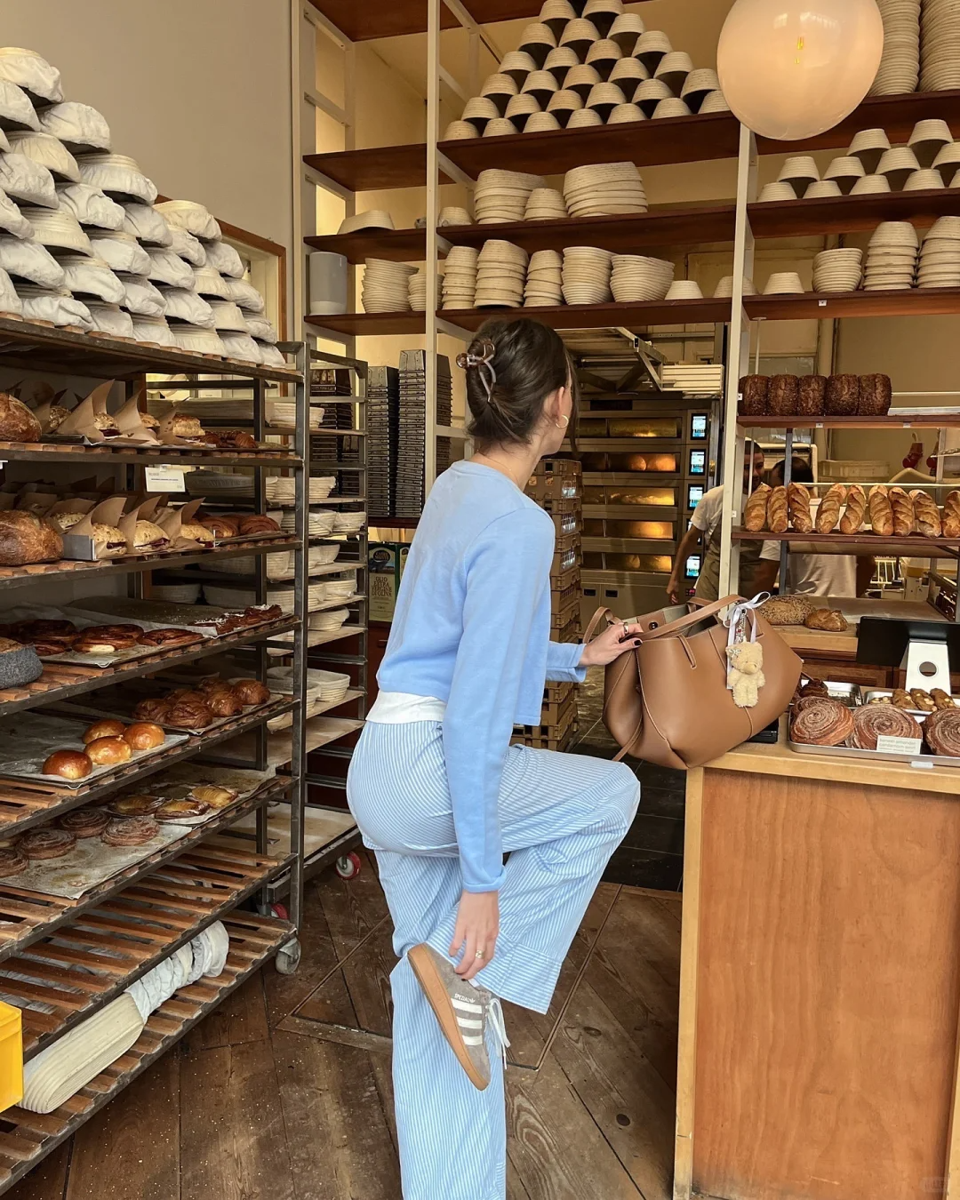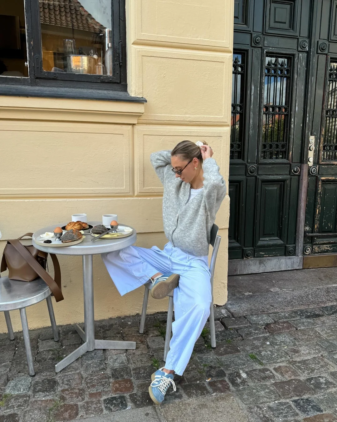 整套搭配以 “蓝 + 白 + 棕” 为核心,