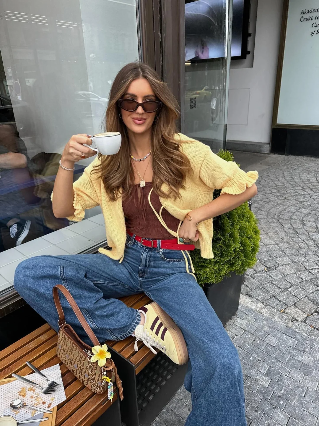 用咖色运动鞋与小方包形成同色系呼应,
