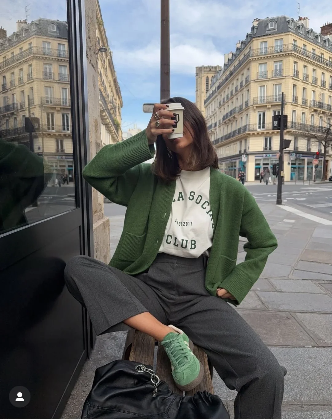 用绿色运动鞋与开衫形成同色呼应,