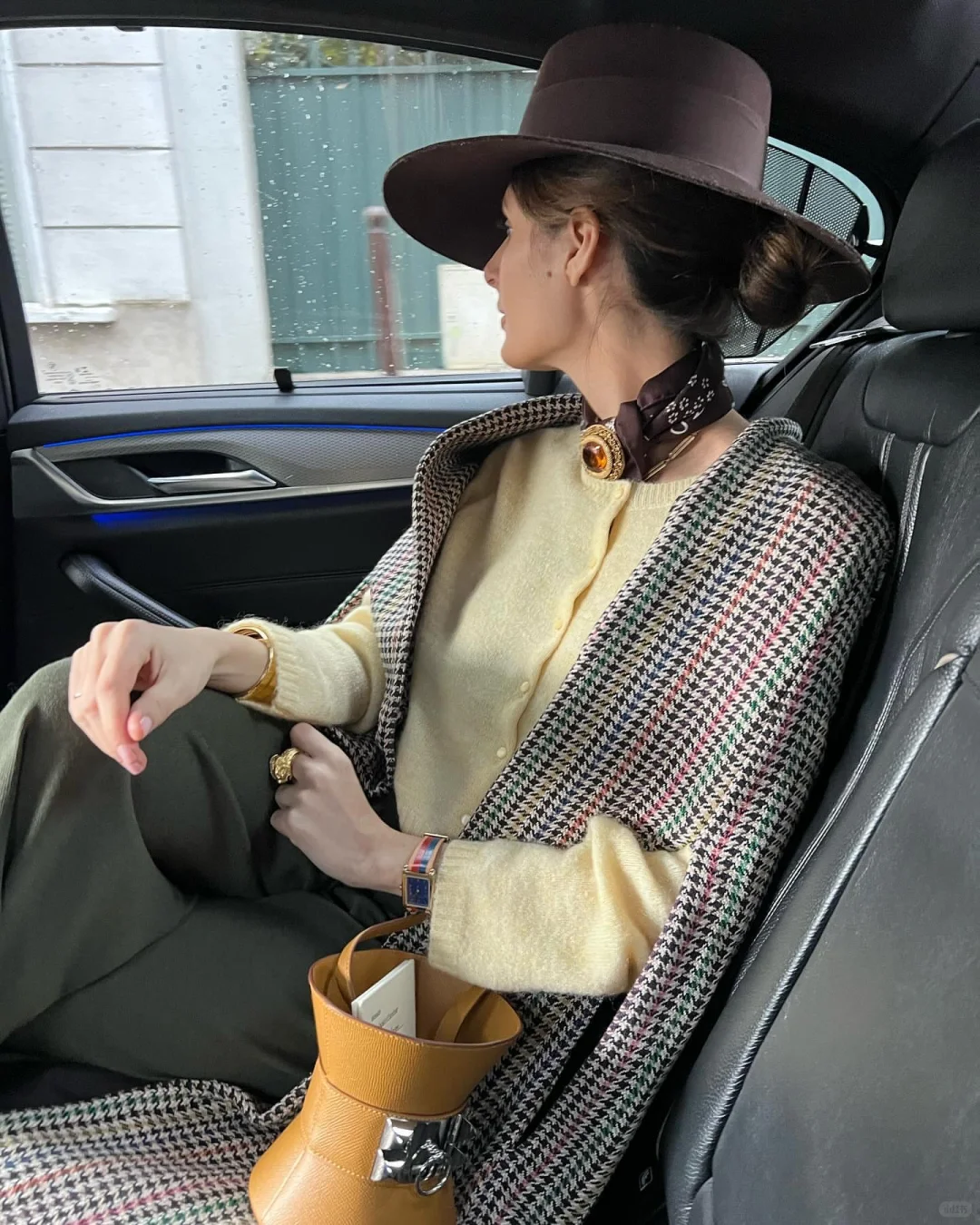 最后用棕色包包形成色彩呼应,