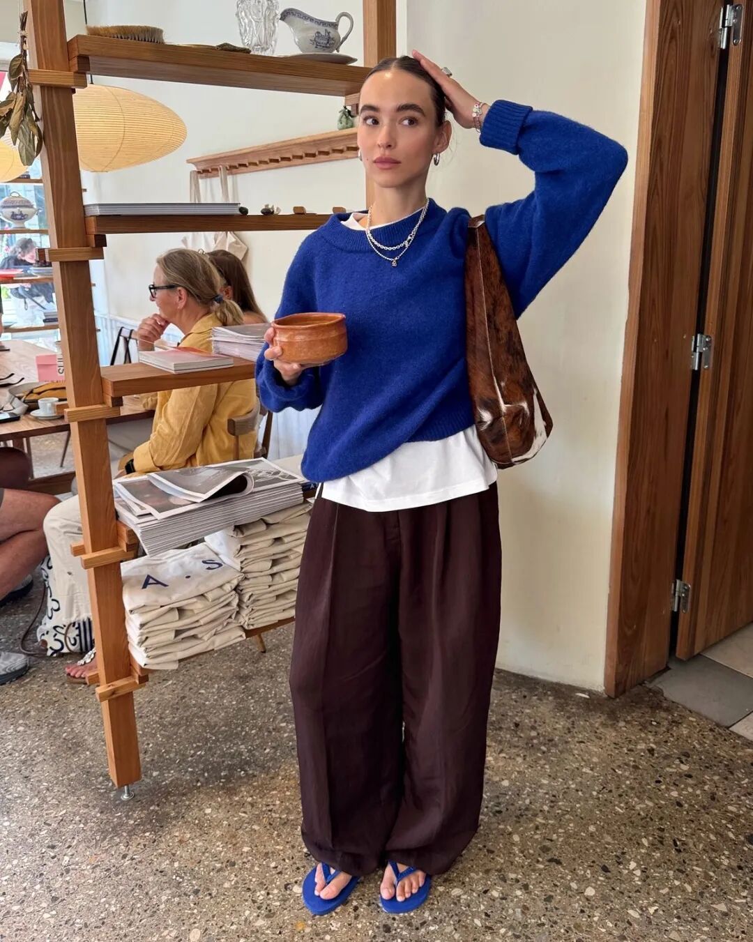再搭配棕色阔腿裤的复古温柔,